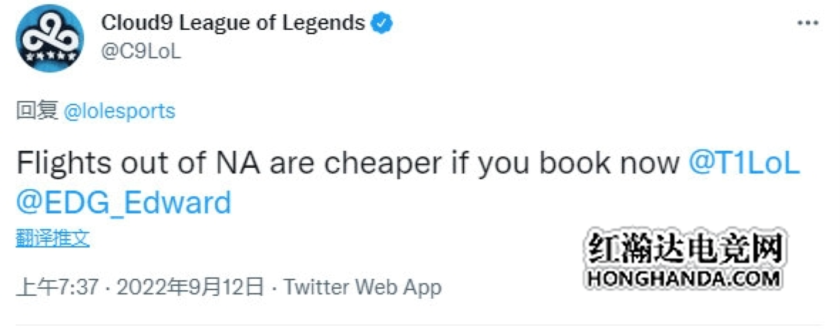跌入死亡之组面对老对手EDG与T1的C9则是推特放出狠话:T1和EDG现在预定北美航班回家还挺便宜的
