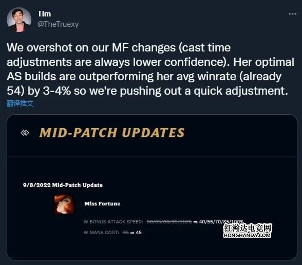 英雄联盟设计师Tim在个人推特上表示即将实装热补丁削弱女枪W技能。设计师表示削弱女枪的原因是此前女枪的Q技能改动(Q技能施法时间随攻速的提升而降低)提升过头了,攻速流出装胜率已经来到54%,比平均胜率高出3-4%,因此紧急削弱了W技能。