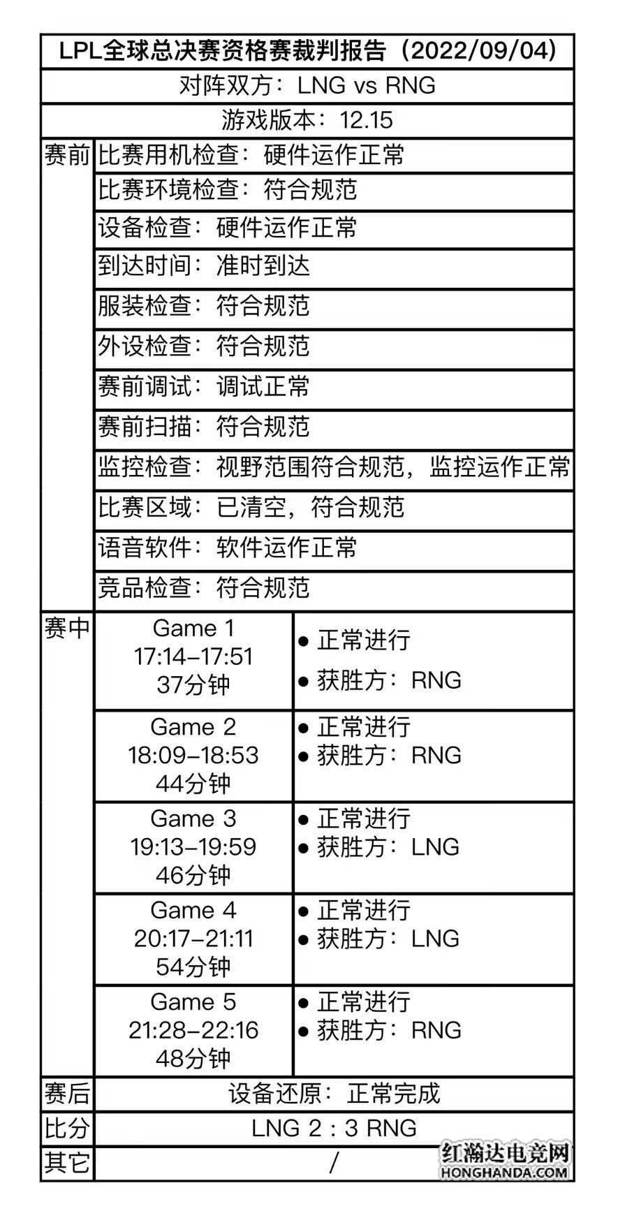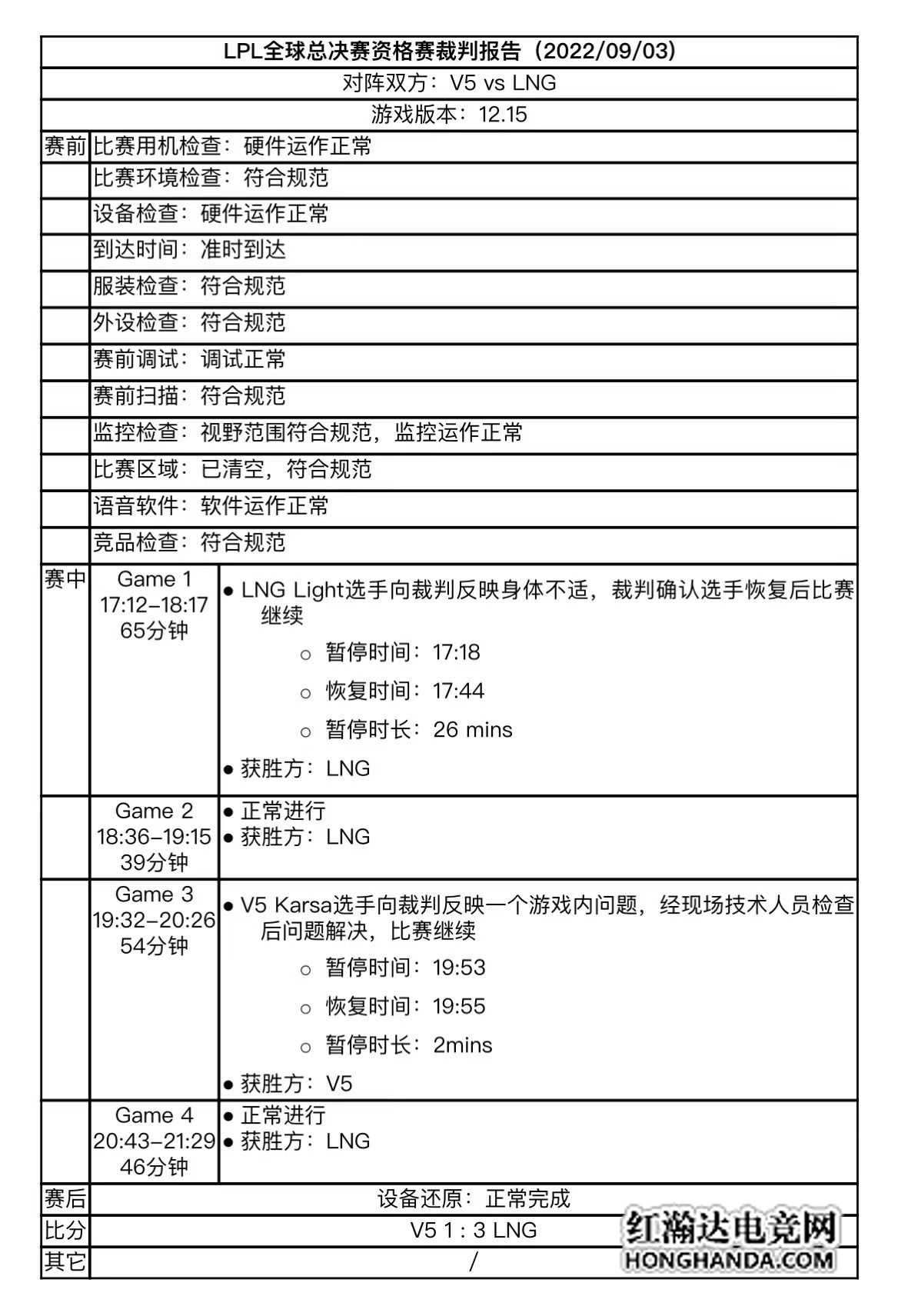 9/3 V5对阵LNG的比赛首局,Light向裁判反映身体不适,裁判确认选手恢复后比赛继续;V5对阵LNG的比赛第三局,Karsa向裁判反映一个游戏内问题,经现场技术人员检查后问题解决,比赛继续。