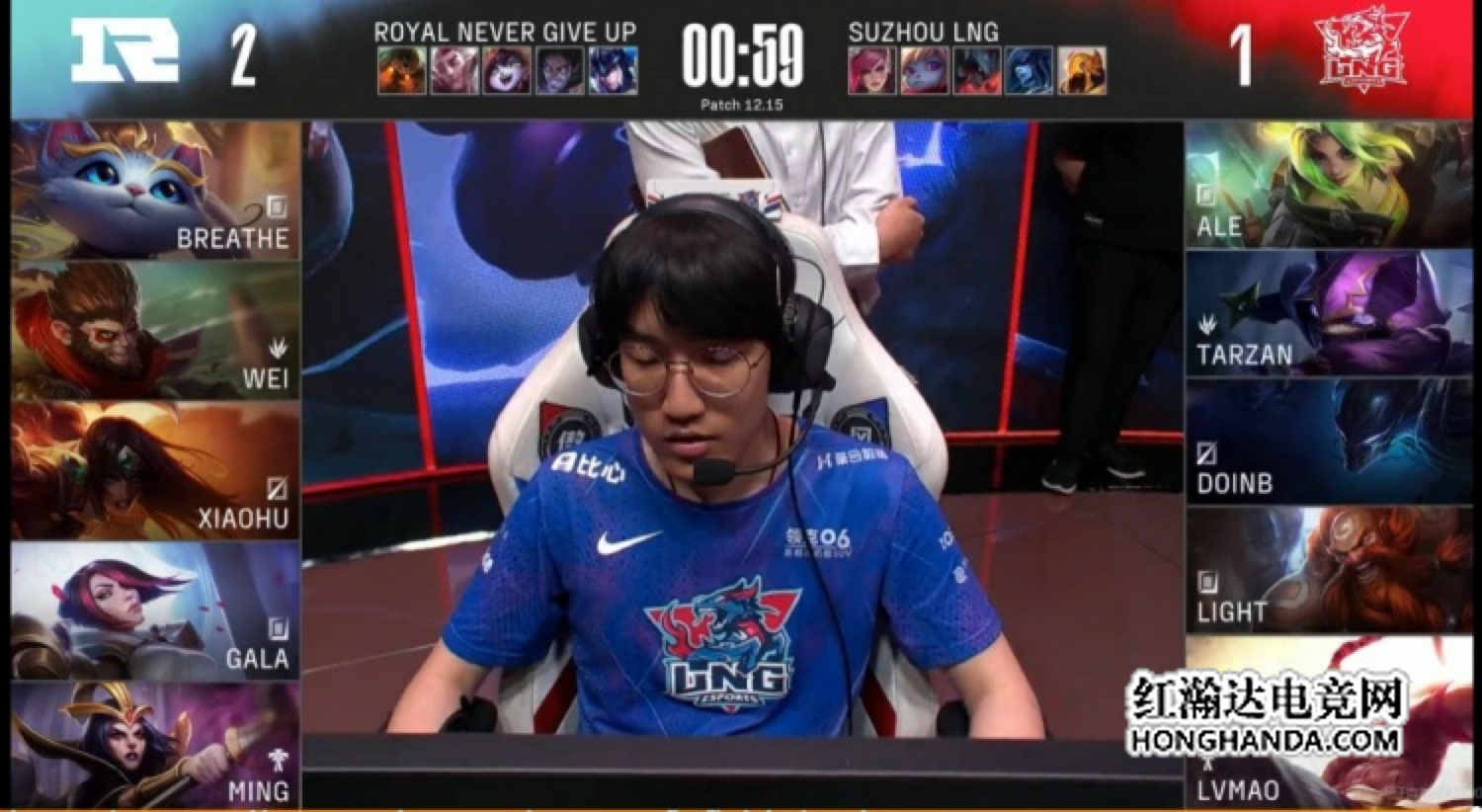 第三局:蓝色方LNG一抢AD选择卢锡安,随后组成了下路卢锡安+娜美组合;红色方RNG将counter pick位给到中单选择狐狸,下路选出了泽丽+璐璐组合。对线期双方平稳运营,LNG下路卢娜组合打出优势,中期LNG快速抱团,Doinb岩雀游走掌控比赛节奏;RNG试图野区伏击击杀武器未果,LNG拿下双龙会,一波推进扳回一局。