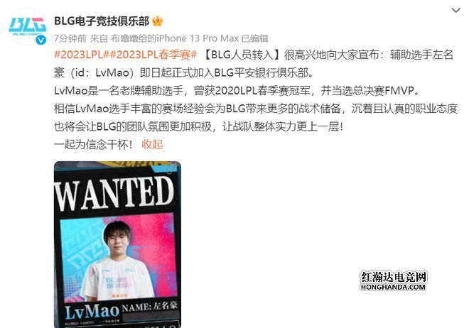 BLG官宣:辅助选手lvmao加入!粉丝拍手叫好
