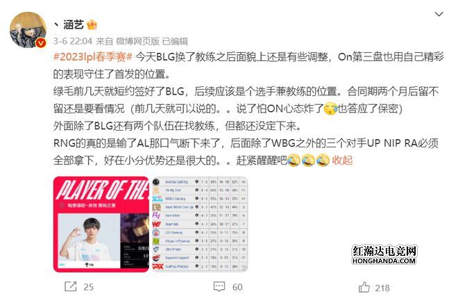 LPL春季赛已经过半,后面的比赛对于不少战队来说都至关重要,强队要争取前二的排名,拿到季后赛复活甲,中游的队伍要努力确保季后赛的名额,争取在季后赛有更高的名次,弱队也有机会在最后阶段冲击 一下季后赛,看看能不能创造奇迹。其中BLG战队以6胜5负的战绩,排在LPL第九名,处于季后赛的边缘,能否晋级尚不确定,而就在这个关键时刻,BLG官宣了新选手的加入,有人员变动了。