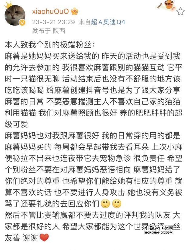 事情是这样的,小虎在深夜突然发文,致自己的个别极端粉丝,表示自己养的猫麻薯本来就是女友送自己的,我们对麻薯都很好,女友对自己也很好,希望粉丝们可以尊重女友,就算不喜欢她,也不要人身攻击她。最后就是希望不管是比赛输了还是赢了,粉丝们都不要评判自己的队友。