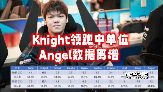 15分钟的领先率,是RNG的Angel选手69.6%,黑天使的数据,是整个前10中单里,最独特的存在,其他中单两个时间段的刀差,不是全正就是全负,唯有Angel人,在10分钟补刀落后1.3,但到了15分这个时间段,突然就领先了3.2,这说明一个问题,前期对线能力差,15分钟其他中单在游走,这5分钟里Angel依旧在补刀偷发育。