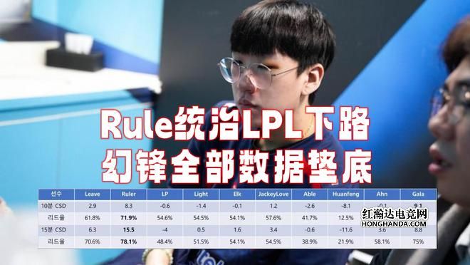 而15分钟的领先率方面,Ruler依旧高达78.1%,除了10分钟刀差被Gala拉开差距,其余所有数据Rule都领跑,可见来到LPL之后,统治力有多强了,而关注度比较高的JackeyLove,各项数据落后于Ruler、Gala、Leave三人,Huanfeng的数据是AD位最拉胯的存在,10分钟落后补刀8.1,15分钟的落后数更是达到了11.6,是前10AD中数据最差的。
