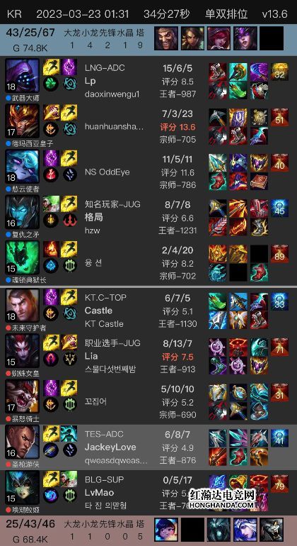 这场战绩如下,对面贾克斯还是LNG的下路LP,拿到了15杀的豪华战绩,而JKL和绿毛这边中野死得比较多,对面中野发育很肥。而且前期上中野全崩了,确实是靠下路带起来的,只是也是下路也送了关键的一波。