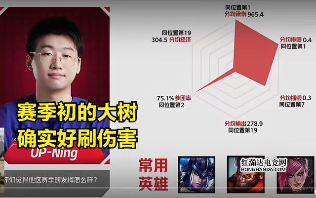 Ning表示up战队赢得比赛当中,自己的大树玩得很好,所以对面的战队根本不放自己的大树,自己如果多拿五场大树,那么自己的输出绝对不会是最低的,经常观看比赛的观众应该清楚赛季初的时候大树这个英雄确实很能刷伤害,经常出现大树全场伤害第一的情况。
