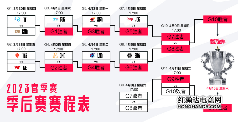 2023LPL春季赛常规赛已经结束,在经历了十周赛事的激烈争夺后,JDG、EDG、LNG、WBG、BLG、OMG、TES、TT、RNG以及WE共十支队伍成功打入了季后赛。而在2023年3月30日这一天,LPL春季赛将开启季后赛新的征程,这十支队伍将向春季赛冠军以及MSI资格发起新的挑战。