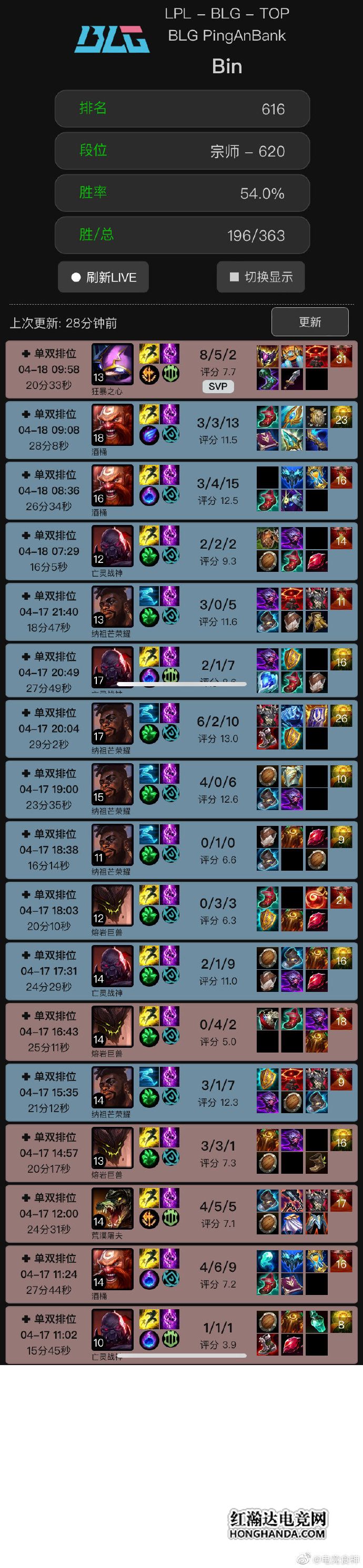 确实,老说369不配,369也不乐意了。不过Bin也很有上进心,在输掉决赛后,他就开始刻苦训练,从近日的排位记录来看,Bin玩的凯南、酒桶、奎桑提、赛恩等,全是369非常擅长的英雄。