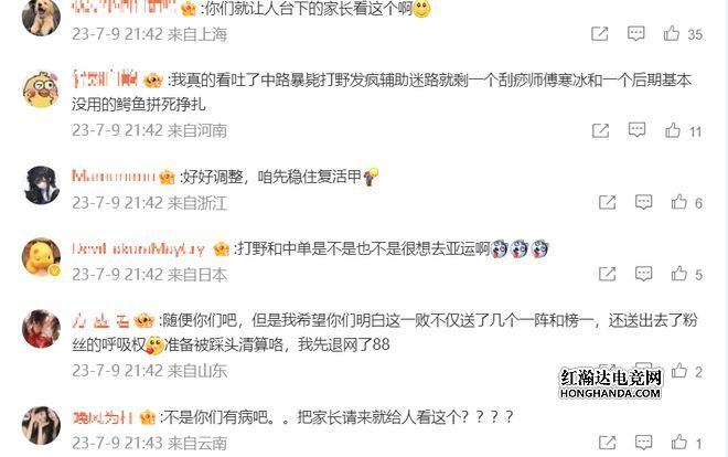 JDG官博下方的评论如下,因为这场missing和Ruler的父母都来到现场看比赛了,谁知道见证了一场败仗,于是很多粉丝怒斥:让台下的家长看这种比赛吗?也有粉丝批评JDG的队员:中路暴毙,打野发疯,辅助迷路,给ruler选艾希刮痧,给369选鳄鱼,后期没有任何作用。还有粉丝吐槽是不是kanavi和knight也不想去亚运会啊?打得太差了。当然也有粉丝安慰队员,表示先稳住复活甲再说。