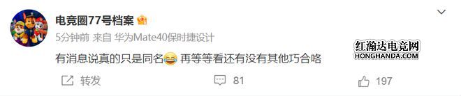 而圈内知名爆料人电竞圈77号也第一时间更新消息,表示:真的只是同名,再等等看还有没有其他巧合吧。只能说这个瓜,吃到现在人已经晕了,还是等待后续消息吧,一切以官方消息为准!