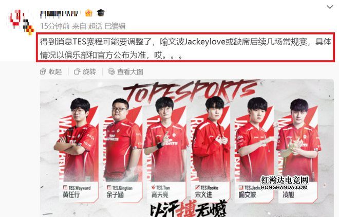 之后有人爆料:TES后续的赛程可能要调整了,JKL将缺席后面几场常规赛,具体以官方消息为准。