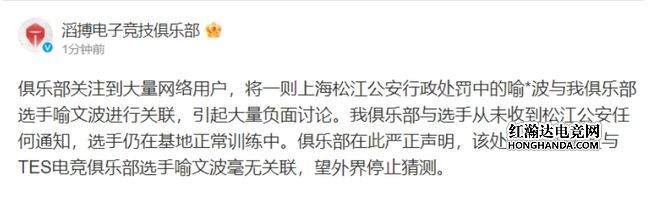 TES官博辟谣的消息如下,表示:上海松江分局公布了喻X波的行政处罚,大量网络用户将喻X波与喻文波关联,但是喻文波选手从未收到松江分局的任何通知,目前正在基地训练中,喻X波并不是JKL。