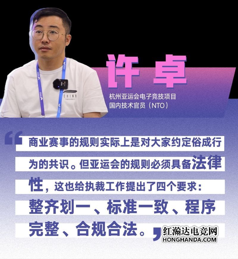 许卓说道:亚运会的裁判工作和竞赛工作,我们叫赋权。当相应人员被赋权进入到某一项工作环节的时候,他才能够参与工作。所以从流程性来讲的话,这本身就是这个行业需要重新学习的。规则上,商业赛事的规则实际上是对大家约定俗成行为的共识。但亚运会的规则必须具备法律性,运动员可以针对裁判的判罚启用仲裁流程,甚至可以启用法律诉讼流程。这也给执裁工作提出了四个要求:整齐划一、标准一致、程序完整、合规合法。