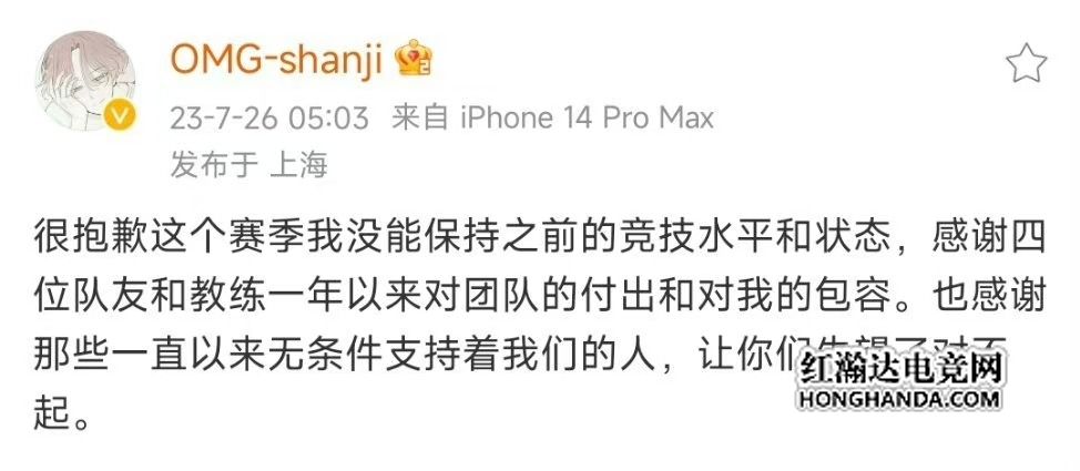 Shanji发文说道:很抱歉这个赛季我没能保持之前的竞技水平和状态,感谢四位队友和教练一年以来对团队的付出和对我的包容。也感谢那些一直以来无条件支持着我们的人,让你们失望了对不起。其实在其中一局,作为中路的Crème也出现了大失误,很多粉丝网友都觉得不应该,但这毕竟是季后赛,而且还是面对EDG,大家还是多理解理解新生选手吧。