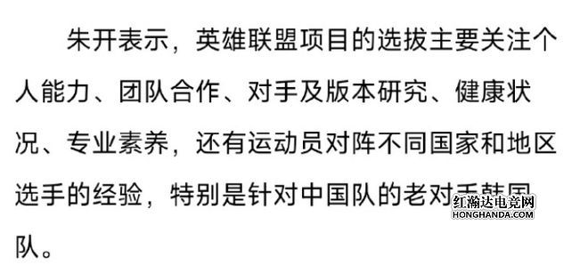 然后朱开还谈到了选拔主要考虑的几个点,分别是个人能力、团队合作、对手以及版本研究、健康状态、专业素养,其中还要参考过去选手在面对韩国队时的经验。
