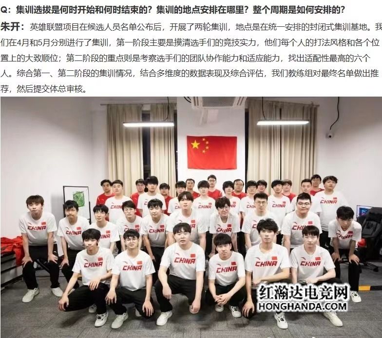 教练朱开说道:在4月初根据集训队运动员候选人的选拔要求,综合考虑选手们近期在国际大赛、联赛的一些表现,以及选手的职业素养最终确定了25人的一个名单。4月下旬进行了第一次集训,目标是为了通过频繁的选手调动,以及英雄的组合,找到各个位置上差异度最大的一些选手,明确每个位置上大致的选手顺位情况。5月下旬进行了第二次集训,目标是在每个位置上排名靠前的一些选手中,组建出一支相性最好,并且适配度最高的一支队伍。
