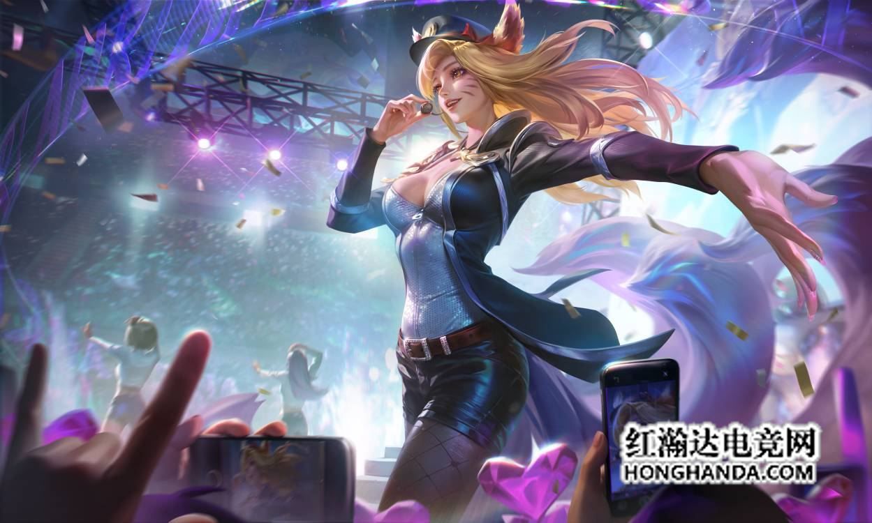 其次就是偶像歌手皇室鸢尾。阿狸本身的造型就十分讨喜,偶像歌手让她更具idol气质。臻彩插画的皇室鸢尾,让阿狸在聚光灯下更为亮眼!在舞台上又唱又跳,台下一众拥趸纷纷掏出手机拍照。阿狸热裤配黑丝,风衣下的好身材展露无疑,飘逸的长发也十分美丽!