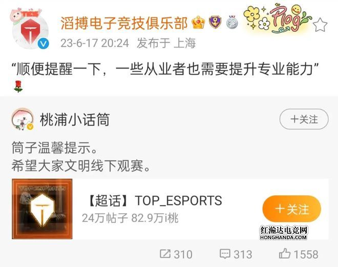 很快TES官博也发声了,先是TES这边呼吁大家文明线下观赛,之后TES官博提醒:一些从业者也需要提升自己的专业能力。这句话很明显说的就是毛毛,作为官方解说在听到现场观众嘲讽选手的时候,不仅没有制止,反而自己跟着乐,还笑出声来,还称赞观众热情,TES官博这边生气也是可以理解的。