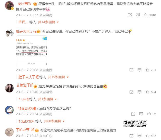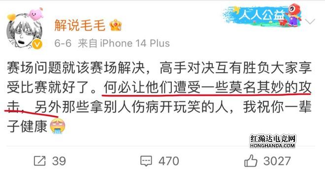 就是这一言行引发了大量的不满,毛毛的微博一般只有几十条回复,这次已经被骂了上千条了。大量JKL粉丝认为马上亚运会了,作为LPL官方解说还在带头玩梗调侃选手的黑称,这就是LPL官方解说的含金量吗?有这个时间吃选手的黑流量,不如去提高一下自己的解说水平。