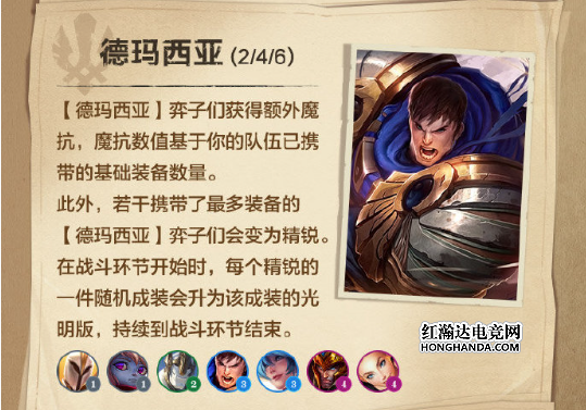 德玛西亚:因为禁魔石的影响,德玛西亚的弈子会获得额外的护甲和魔法抗性,数值取决于队伍中基础装备的数量,并且队伍中携带装备最多的德玛西亚弈子会成为“精锐”,将自身一件随机成装升级为光明版。
