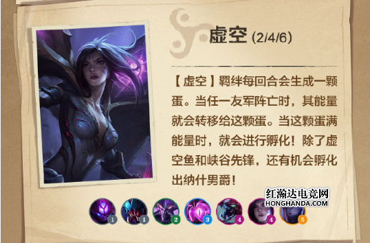 虚空:虚空弈子每回合会制造一颗虚空蛋,每当友军阵亡时都为为其提供能量,孵化能量充满时会召唤一个虚空生物作战,召唤物的属性和类型根据虚空弈子的星级总和以及羁绊数量改变,满层羁绊的时候弈士们甚至可以孵化出纳什男爵!