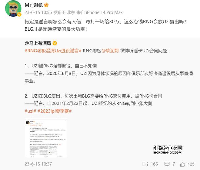 LPL夏季赛常规赛的比赛,因为Uzi的复出导致热度上升了不少,而就在Uzi加入EDG首秀大获成功后,因为Uzi在赛后采访时,提到自己为了复出经历了很多艰难时,忍不住当场落泪。于是赛后很多人怒斥RNG卡合同,强迫Uzi退役,才导致Uzi不得不在多年后才能重返赛场。而就在凌晨时分,RNG老板出面辟谣了。