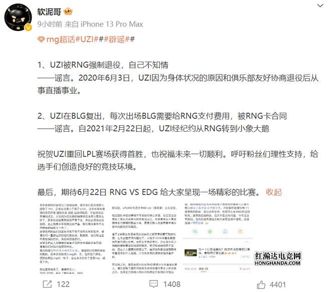 RNG老板发文如下,首先他表示在20年Uzi的退役仪式,并不是俱乐部强迫Uzi退役的,是因为他的身体状况不好,和俱乐部协商后决定退役转型主播的。然后回应了Uzi在BLG复出后,如果要在BLG打比赛,BLG需要向RNG支付费用,被RNG卡了合同,RNG老板辟谣表示当时Uzi的经纪约已经不在RNG了,所以不存在上述事情。最后就是祝贺了Uzi重返赛场获得首胜,也呼吁粉丝们理性支持,期待RNG和EDG的比赛。