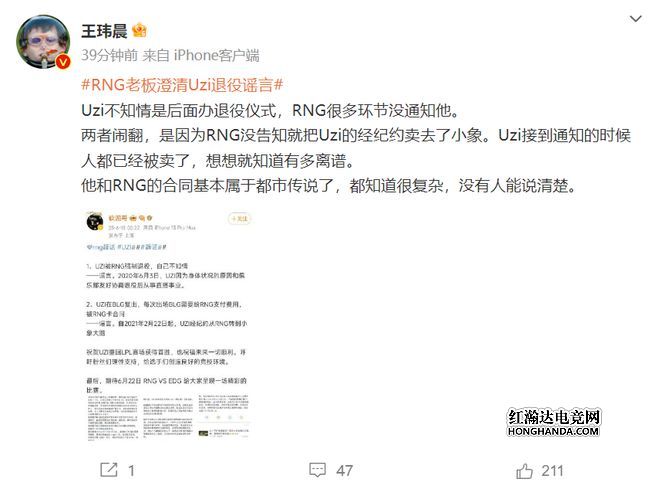 另外体坛周报记者王玮晨也爆料:当初在RNG办退役仪式的时候,Uzi是不知道最后要办退役仪式的,RNG没有提前通知他。而Uzi和RNG闹掰,是因为RNG没有提前告诉Uzi,就把他的经纪合约卖给了小象。这波爆料也算是再次打脸RNG老板了。