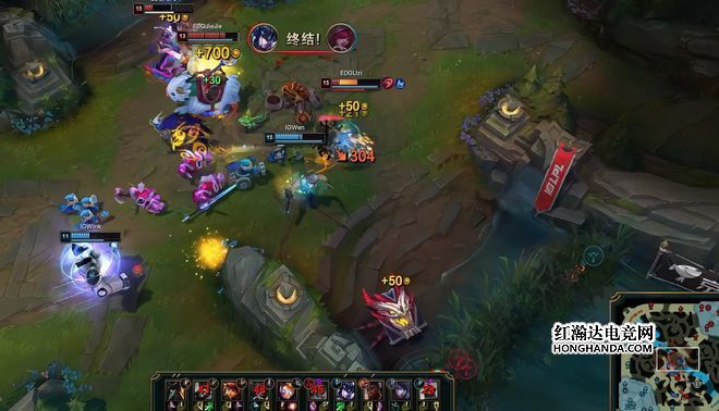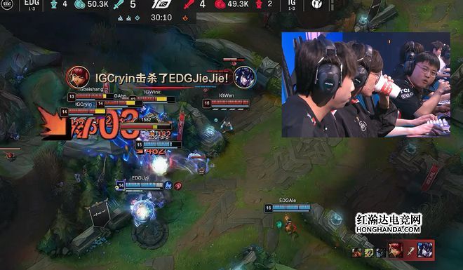 20分钟EDG五人埋伏野区草丛,抓死IG双人组拿大龙,正面一波轻松碾压,以2-1得分赢下比赛胜利!