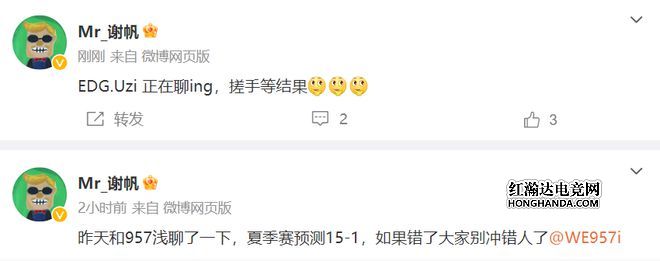 而之后又一位圈内大佬爆料:EDG uzi正在聊!这位爆料人和WE老板关系非常好,和WE一些老队员都有来往,经常发布一些和WE相关的问题,之前爆料说WE要去参加亚运会预选赛的就是他。