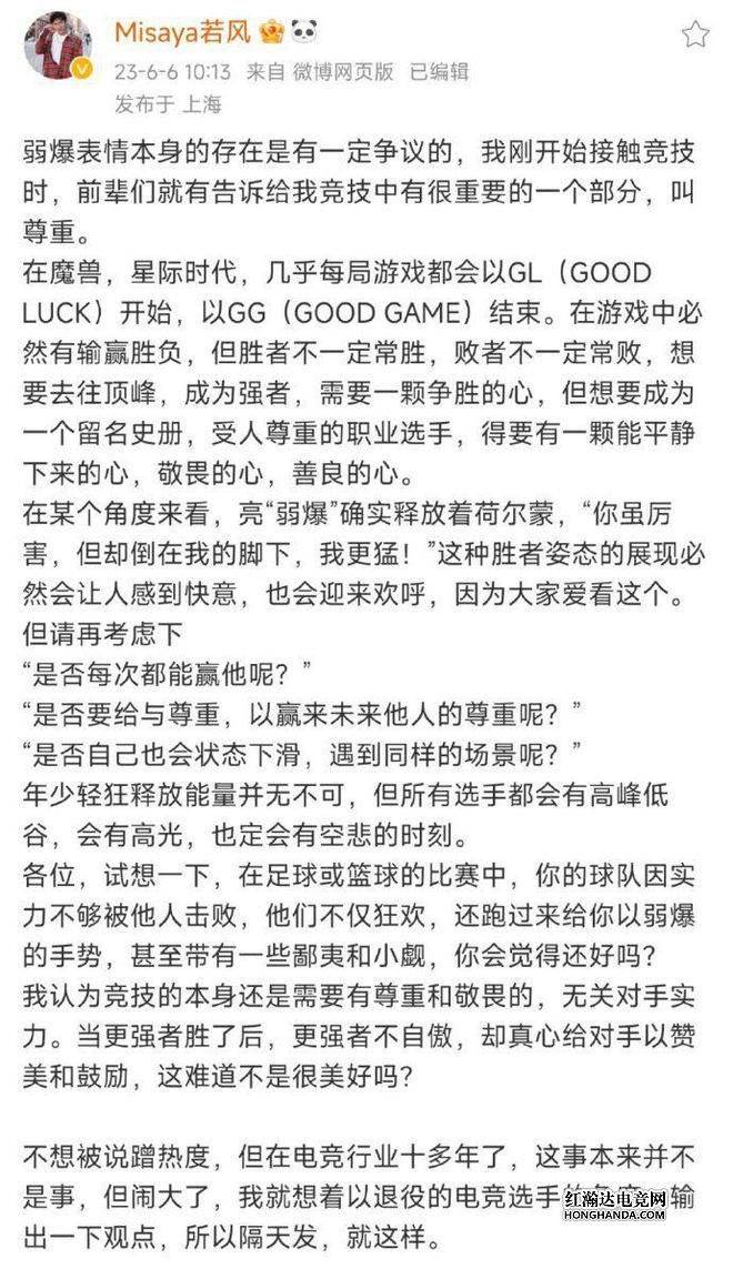 若风的发言如下图所示,他表示:弱爆这个表情本来就是有一定争议的,自己刚打职业的时候,很多前辈选手就告诉了自己一个很重要的事情,就是尊重。之后他开始回顾一些电子竞技比赛的过程,表示想要成为受人尊重的制约安守,必须有一颗敬畏和善良的心。接着回到弱爆这个话题,若风认为大家爱看战胜强者后亮弱爆的感觉,但任何选手都有年少轻狂的时候,也会遇到低谷期,任何竞技都该有敬畏和尊重,自己不是蹭热度,只是以前职业选手的角度发表一下自己的观点。