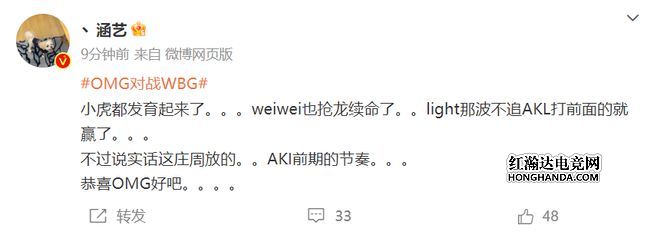 另外前V5教练涵艺也在看了这场比赛后,说了和很多WBG粉丝一样的话。他也认为那波团战如果light不去追阿卡丽,WBG应该赢团了,前期就会拿到不错的优势,至于BP,他也觉得不该放明烛给OMG,WBG自己可以拿卢锡安和明烛的。当然他也称赞了OMG打野Aki前期节奏太好了,而WBG打野weiwei抢龙也很关键。