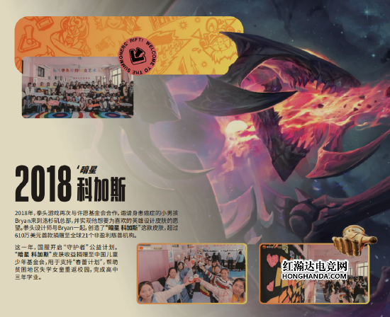 2018年,具有重要意义的“暗星 科加斯”正式上线,这款皮肤由拳头游戏设计师携手身患癌症男孩Bryan共同创作,并由后者亲自创作了一小段BGM以纪念。也是在这一年,《英雄联盟》国服开启“守护者”公益计划,携手“春蕾计划”与召唤师一起帮助失学女童重返校园。此后至今的五年时间,“守护者”公益计划不断通过推出慈善皮肤的方式,邀请召唤师们守护美好,让世界多一点温暖。