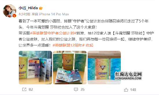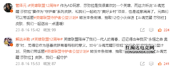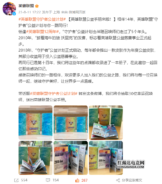 8月11日,《英雄联盟》发布公益手册,与召唤师一同回忆英雄联盟公益慈善事业和“守护者”公益计划走过的岁月。手册发布后,来自LPL的官方解说、主持人,以及各大电竞俱乐部纷纷转发分享公益故事,并送出2023年新款公益皮肤“斗魂觉醒 莎弥拉”邀请玩家一起助力公益行动。