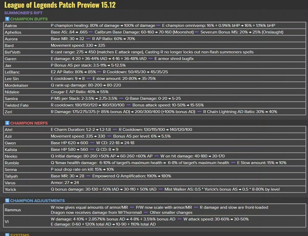 英雄削弱:阿狸,阿兹尔,格温,卡莉斯塔,妮蔻,兰博,赛娜,岩雀,维鲁斯,约里克