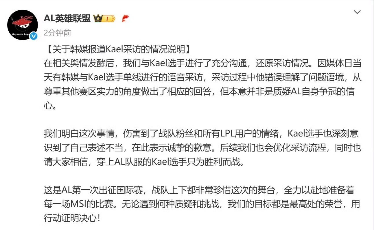 AL发文表示到:在和Kael进行了充分沟通后,还原了当时采访情况。因为媒体当天韩媒和Kael选手单线进行了语音采访,过程中选手本人理解错了问题语境,从尊重赛区角度出发回应了相对的问题,本意并非质疑AL自身争冠的信心。Kael本人也是发文说道:十分抱歉,以后会更加注意采访,MSI的比赛自己会加油。