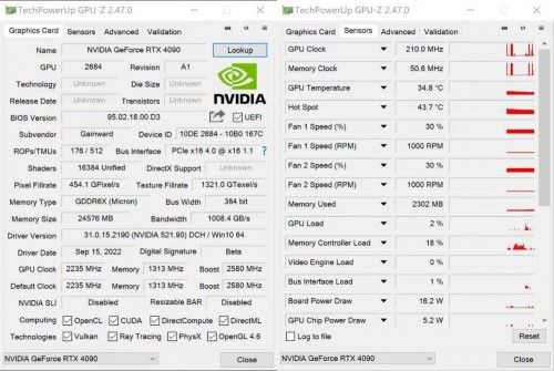 由检测软件GPU-Z可看到升 GeForce RTX 4090 炫光 OC的产品规格和基本参数,以及其待机温度为34.8°C,功耗为16.2W。