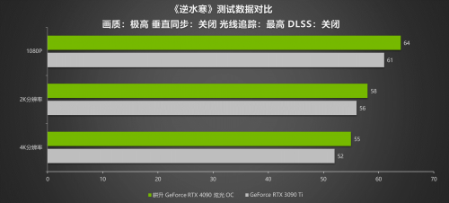 在光追游戏《消逝的光芒2:人与仁之战》中,GeForce RTX 4090 依然有不俗的表现:在极限画质下开启DLSS 3 质量模式后,1080P能跑到140帧,2K分辨率能跑到128帧,4K分辨率能跑到118帧,相较于GeForce RTX 3090 Ti有30%~55%的性能提升。这个帧数对于第一人称游戏来说也可以达到完美游戏的标准,能很好地满足各玩家不同的需求。