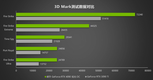 首先使用3D Mark软件来进行GPU各项基准测试。从测试结果上来看,耕升GeForce RTX 4090 炫光 OC GPU较于RTX 3090 Ti有明显的性能提升:Fire Strike提升了40%,Fire Strike Extreme提升了68%,Time Spy提升了34%,Port Royal光追测试中提升了68%,Fire Strike Ultra提升了80%。这得益于 耕升 GeForce RTX 4090 炫光 OC采用了全新Ada架构和光流加速器,能使GPU性能和光追性能得到进一步大幅度提升。