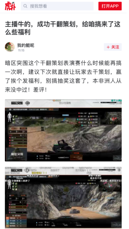 而全程观赛的玩家们,对于主播队成功干翻策划是赞叹不已,纷纷表示干得漂亮,毕竟面对的是每天疯狂亿遍的策划,代入感不要太强,试问谁还没在玩游戏时骂过一句“xx策划”呢!不得不说,暗区官方搞这样一场别开生面的比赛,可谓是用意深远。不但给了玩家一个宣泄对策划愤恨情绪的机会,同时也通过送福利,拉近了官方与玩家之间的关系。