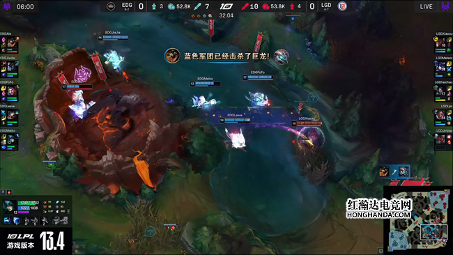 大树在下路发起Gank闪现协助队友拿到了艾希人头,不久后又在上路抓死了赛恩,EDG继续前期试图控制资源,但第一条小龙已经落入LGD之手,接下来双方下路在河道对拼打成1换1,LGD又在小龙团击杀了沙皇,EDG前期节奏陷入全面被动,只能收缩防线保持发育,找到一些破绽击杀了杰斯与大头,逐渐稳住了局势。22分钟左右EDG故技重施突然先手击杀了大树,随后利用人数优势直接开打大龙,LGD四人虽然无法抢掉大龙,但发育良好的奎桑提冲入人群如同天神下凡一打三斩获三杀,带领LGD在四打五的情况下团灭了EDG!