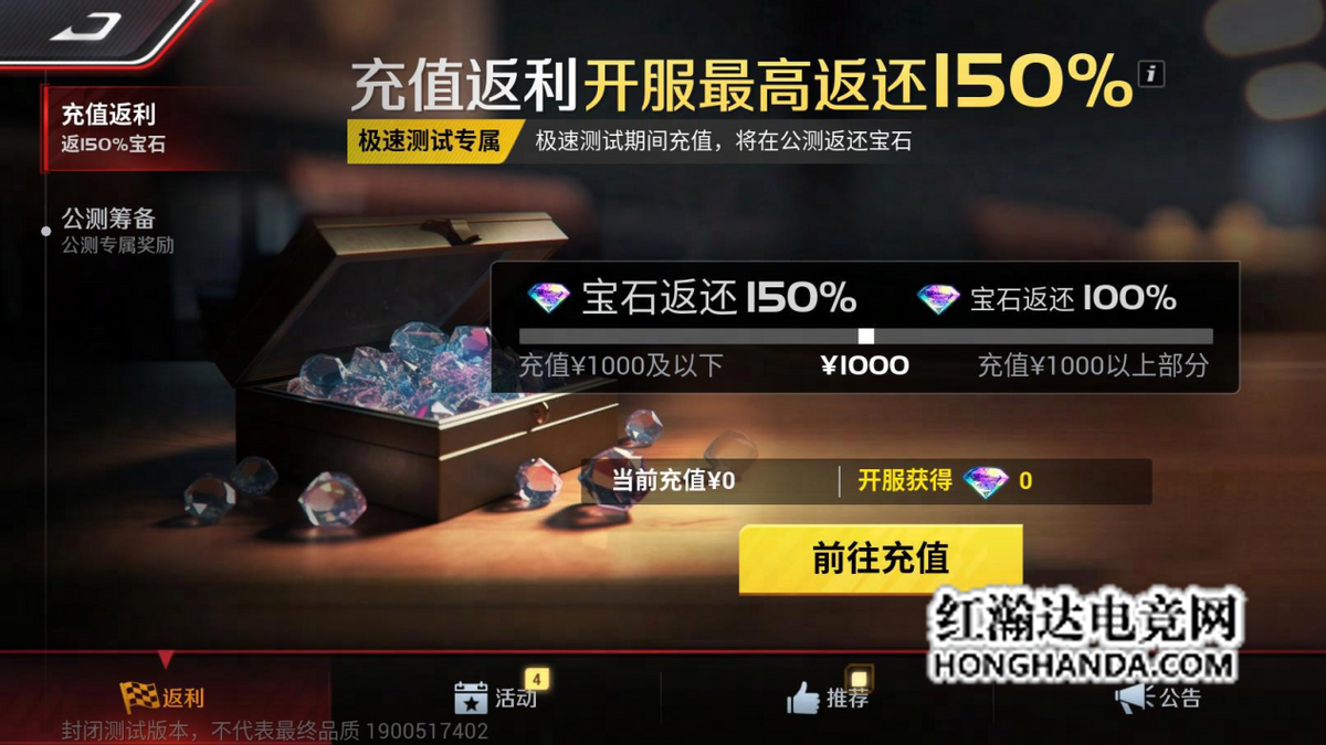 本次极速测试开放了付费充值系统,因此除了活跃返利之外,测试期间充值付费也将在公测时获得返利。“极速测试”期间车手们的充值记录将被保留至正式上线阶段,届时将按大家“极速测试”充值金额进行返还,最高返还比例可达150%!返利具体规则可戳链接查看:https://url.163.com/gYxM