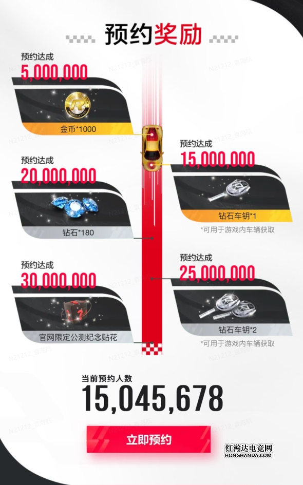 官网预约人数已达1500万,公测全服奖励升级!只要在官方进行游戏预约,即可在公测开启时,领取钻石、钻石车钥、神秘奖励等豪礼,让你狂领豪车爽不停!