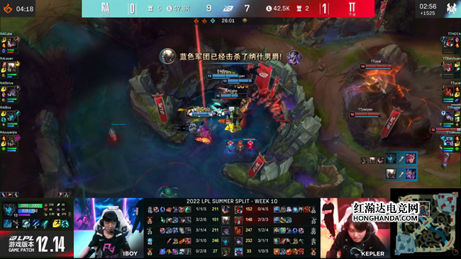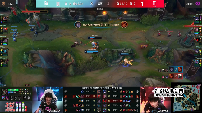 2022 LPL夏季赛常规赛第十周第六天,季后赛的资格争夺进入尾声,TT战队只要击败RA就能锁定季后赛资格。但他们如果落败的话就会彻底无缘季后赛。BLG则会获得晋级的理论希望。这场BO3的发展也像季后赛名额的争夺一样胶着而充满悬念,TT在赢下第一局以后被RA连追两盘,本赛季仅获得3胜的RA发挥了水鬼潜力,2:1亲手将TT拽出季后赛。
