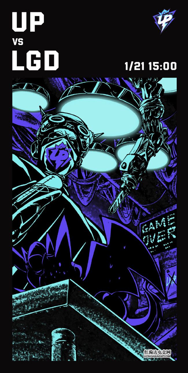 UP的海报标题为“开 刀”,UP旗下的“外科医生”戴着印有自家队标的口罩,将LGD的吉祥物小红龙按在手术台上,右侧的机械手术刀蠢蠢欲动,把小红龙惊出了一身冷汗,手术刀下方的“GAME OVER”似乎预示着小红龙被“开刀解剖”的结局。UP自开赛至今苦吞三连败,好消息是今天他们和同样三连败的LGD必有一队能够解锁首胜,至于坏消息究竟会带给对手LGD,还是落在自己头上呢?