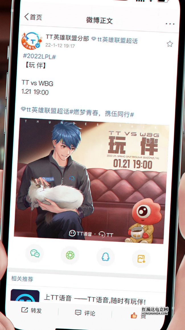 TT的海报标题为“玩 伴”,海报中的手机屏幕上正是TT战队官方微博发的海报,WBG的吉祥物大眼仔捧着猫粮,满眼期待着能和TT蓝发少年怀抱的猫猫成为玩伴,海报下方的“相关推荐”正是TT语音的slogan——TT语音,随时有玩伴!惨遭4连败的TT目前处于积分榜倒一,虽然紧凑的赛程给到TT选手们远超其他队伍的压力,但“以赛代练”的TT众将的状态也是肉眼可见地提升,希望今天TT能够突破自我!