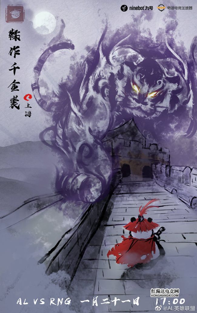 AL的海报标题为“虎山行”,熊猫侠客趁着月黑风高摸到了长城上,不料守关神兽“拦路黑虎”突然现身,熊猫侠客的目标正是海报左上角的“鞣作千金裘”,暗示今天将击败Xiaohu率领的RNG~两连败的AL本场的首发中单仍然是Maple,期待他和老对手Xiaohu的精彩对决!