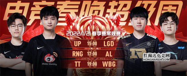 北京时间1月21日,LPL春季赛第二周的“超级周五”揭开了“电竞春晚超级周”的序幕:下午15:00,三连败的“难兄难弟”UP、LGD冲击首胜;17:00的第二场由AL迎战RNG,Xiaohu、Maple“虎虎争锋”;晚上19:00,苦吞四连败的TT直面WBG,Shy哥登场能否“全鲨了”?