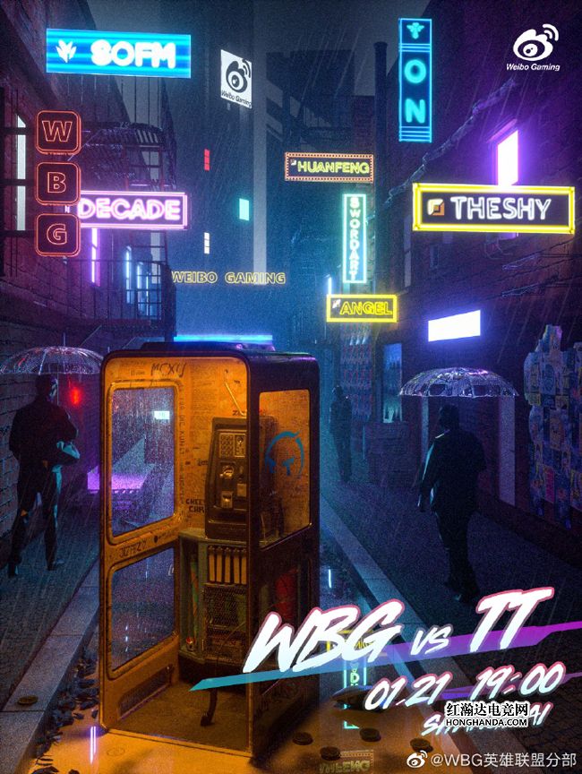 WBG的海报标题是“报废”,灯牌林立的繁华街巷中,一个玻璃上贴有TT队标LOGO的报废电话亭显得格格不入,远处的灯牌上则是WBG的队名和选手们的ID。LPL“唯一指定搞子队”WBG上一场打BLG时“节目效果拉满”,虽然选择了“弹幕最多的打法”,但战队成绩固然十分重要。今晚WBG是否会送给TT的赛季首胜呢,让我们拭目以待吧!